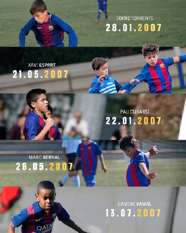 在见证了87一代的辉煌后,拉玛西亚又涌现出一批新的天才。恰好比87一代小了20岁,同样都生于2007年的亚马尔、库巴西和贝尔纳尔组成了全新的三人组。跟他们一样,出生于2007年的还有埃斯帕特和托伦茨。
