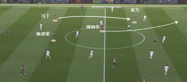 对手的确没有料到巴萨后腰从德容变成贝尔纳尔之后,会有这样的战术变化。事实上哪怕是使用卡萨多,也不会看到他前插进攻三区的肋部。